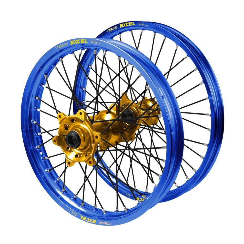 - Kawasaki KX 450 F 2019-2026 (21*1.60 / 18*2.15) Haan Gold Hubs / Excel Blue Rims / Black Spokes Wheel Set