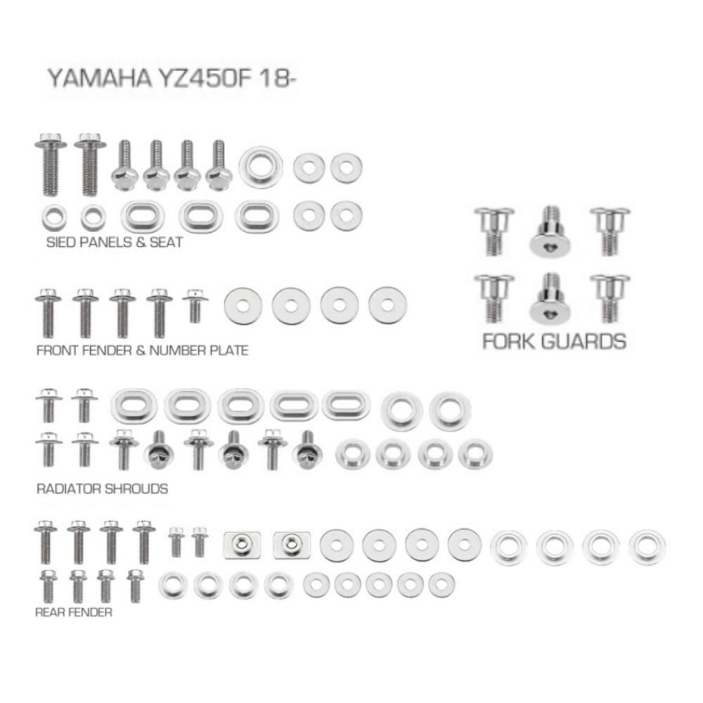 - Full hardware kit for front & rear fenders, radiator shrouds, side panels, fork guards and front plate.
